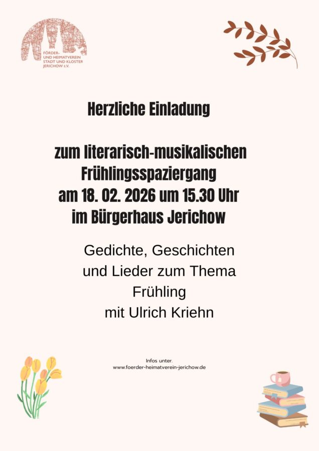 Damit auch das Gemeinschaftliche nicht zu kurz kommt, werden frühlingshafte Lieder zur Gitarrenbegleitung gemeinsam gesungen. In angenehmer Runde möchten wir uns so gemeinsam auf den Frühling einstimmen. Der Heimat- und Förderverein Jerichow e. V. freut sich auf Ihr und euer Kommen!